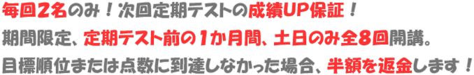 定期テスト 1か月前からの毎週土・日の全8回、毎回最低4時間以上、塾長が「もう今日はムリだな」と判断するまでトコトンやってもらいます。 4時間と聞くと長いようですが、今までも体験学習に来られた方は普通に学習して帰られている時間です。集中していると本当にすぐですよ! |