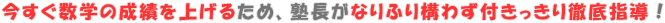 本来、越山志塾の指導は教え過ぎないコーチング指導。 教え込まれる指導では高校に入学してからの学習に悪影響があると考えるからです。 …とはいっても、「そんなこと言っていられない!今すぐ何とかしたい!」といったせっぱつまった状況の方もおられると思います。 「ヤバい…このままじゃ公立高校には…。」 「5科目での順位はそこそこ取れているけど、数学が足を引っ張っていて…。」 といった中学生の方に朗報! |